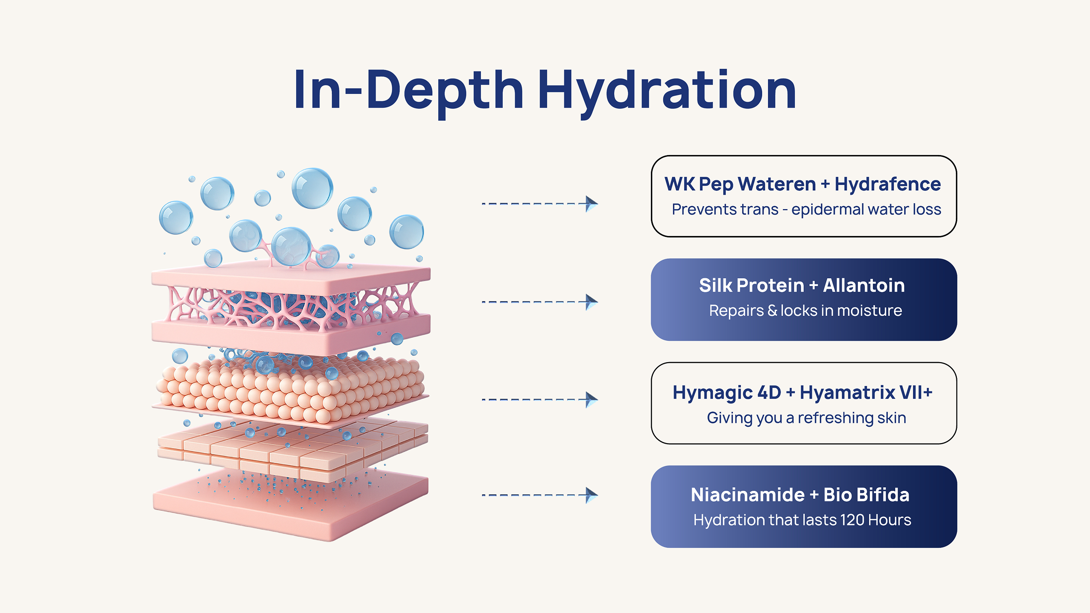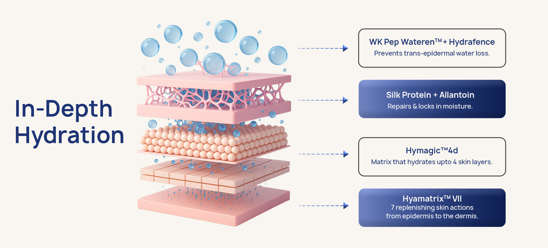 A 3D hyaluronic acid matrix that penetrates four skin layers, replenishing from outside and locking hydration inside.